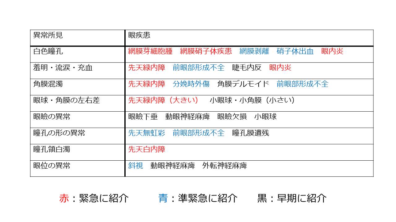 眼科へ紹介を要する異常所見と緊急度を表1に示す(参考文献1より改変)