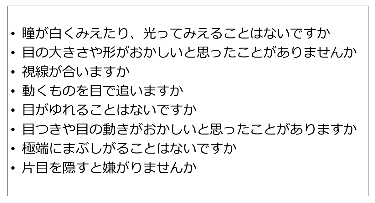 問診や家族歴で気になる点があれば、眼科受診を促す。