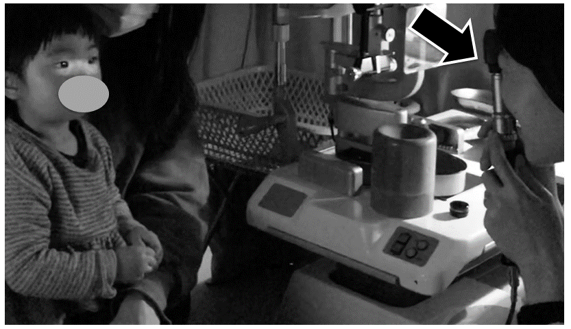 Red reflex法:直像鏡(検影器)を使用して眼底からの反射を瞳孔から観察する方法であり、