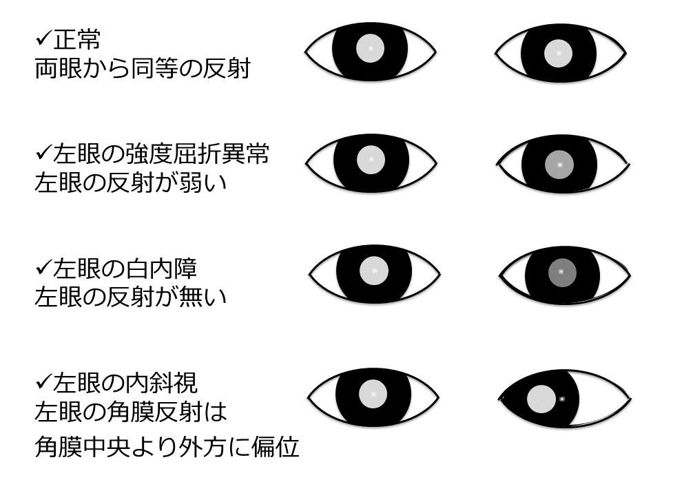 角膜混濁、白内障、網膜芽細胞腫、網膜剥離などの疑いのある児を簡便に検出できる有効な方法である。