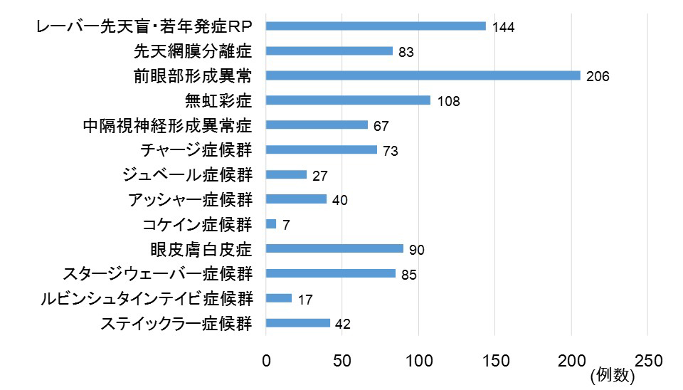 中隔視神経形成異常症、チャージ症候群、ジュベール症候群、アッシャー症候群、 コケイン症候群、眼皮膚白皮症、スタージウェーバー症候群、ルビンシュタインテイビ症候群、ステイックラー症候群