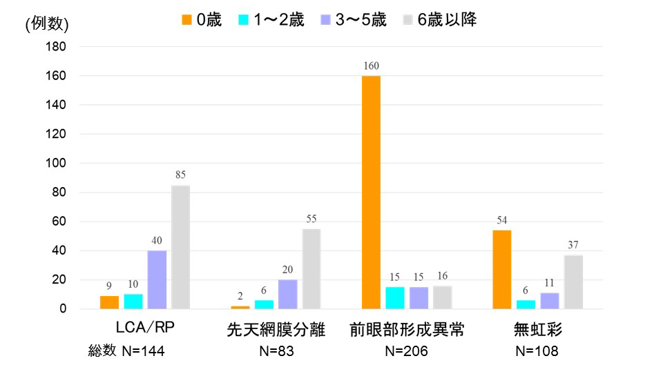 前眼部疾患は0歳代が多く、後眼部疾患は6歳以降と発見が遅れている